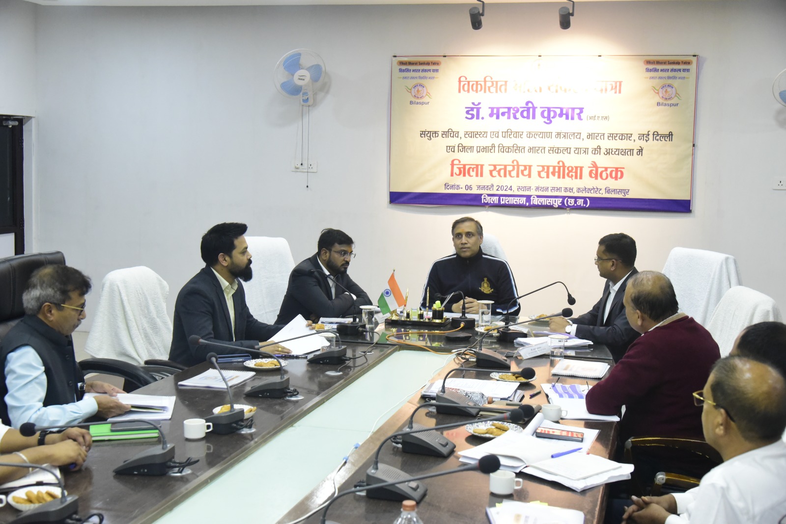 विकसित भारत संकल्प यात्रा के तहत मस्तूरी के वेद परसदा में आयोजित शिविर के निरीक्षण के बाद संयुक्त सचिव डॉ.मनश्वी कुमार ने जिला कार्यालय के मंथन सभाकक्ष में जिला स्तरीय अधिकारियों की बैठक ली। उन्होंने विकसित भारत संकल्प यात्रा में अब तक की प्रगति की विस्तार से समीक्षा की। डॉ. कुमार ने वास्तविक रूप से हितग्राहियों को केन्द्र सरकार की योजनाओं का प्रत्यक्ष लाभ पहुंचाने के निर्देश दिए, ताकि हितग्राहियों के जीवन में सकारात्मक बदलाव आए । उन्होंने बैंकों के कमजोर प्रदर्शन पर गहरी नाराजगी जताई। उन्होंने आगे के शिविरों के लिए बैंक प्रबंधन को अपने कार्य में सुधार लाने कहा। सभी विभाग एक साथ मिलकर योजनाओं का क्रियान्वयन करें। सभी किसानों का किसान क्रेडिट कार्ड बनवाने के निर्देश दिए। उन्होंने महिलाओं से संबंधित योजनाओं का क्रियान्वयन कर महिला सशक्तिकरण को बढ़ावा देने कहा। बच्चों में कुपोषण की दर में कमी लाने के लिए बेहतर कार्ययोजना बनाकर उस पर अमल करने के भी निर्देश दिए।