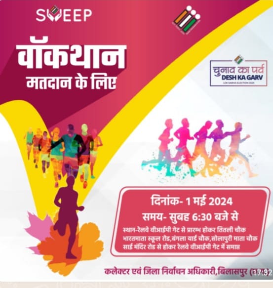 बिलासपुर // लोकसभा चुनाव में मतदाताओं की शत प्रतिशत भागीदारी सुनिश्चित करने के लिए जिला प्रशासन द्वारा लगातार स्वीप की गतिविधियां आयोजित की जा रही है। इसी कड़ी में वॉकथान कार्यक्रम का आयोजन 1 मई को प्रातः 6:30 से किया जा रहा है। वॉकथान में जिले के तमाम वरिष्ठ अधिकारी सहित बड़ी संख्या में लोग शामिल होकर मतदाता जागरूकता का संदेश देंगे।यह वॉकथाम रेल्वे वीआईपी गेट से शुरू होकर तितली चौक, भारत माता स्कूल, बांग्ला यार्ड चौक, सोला पूरी माता चौक, साई मंदिर रोड से होते हुए रेल्वे वीआईपी गेट मेंसमाप्त होगी। कलेक्टर एवं जिला निर्वाचन अधिकारी ने जिले वासियों को इस कार्यक्रम में अधिक से अधिक संख्या में शामिल होने की अपील की है।