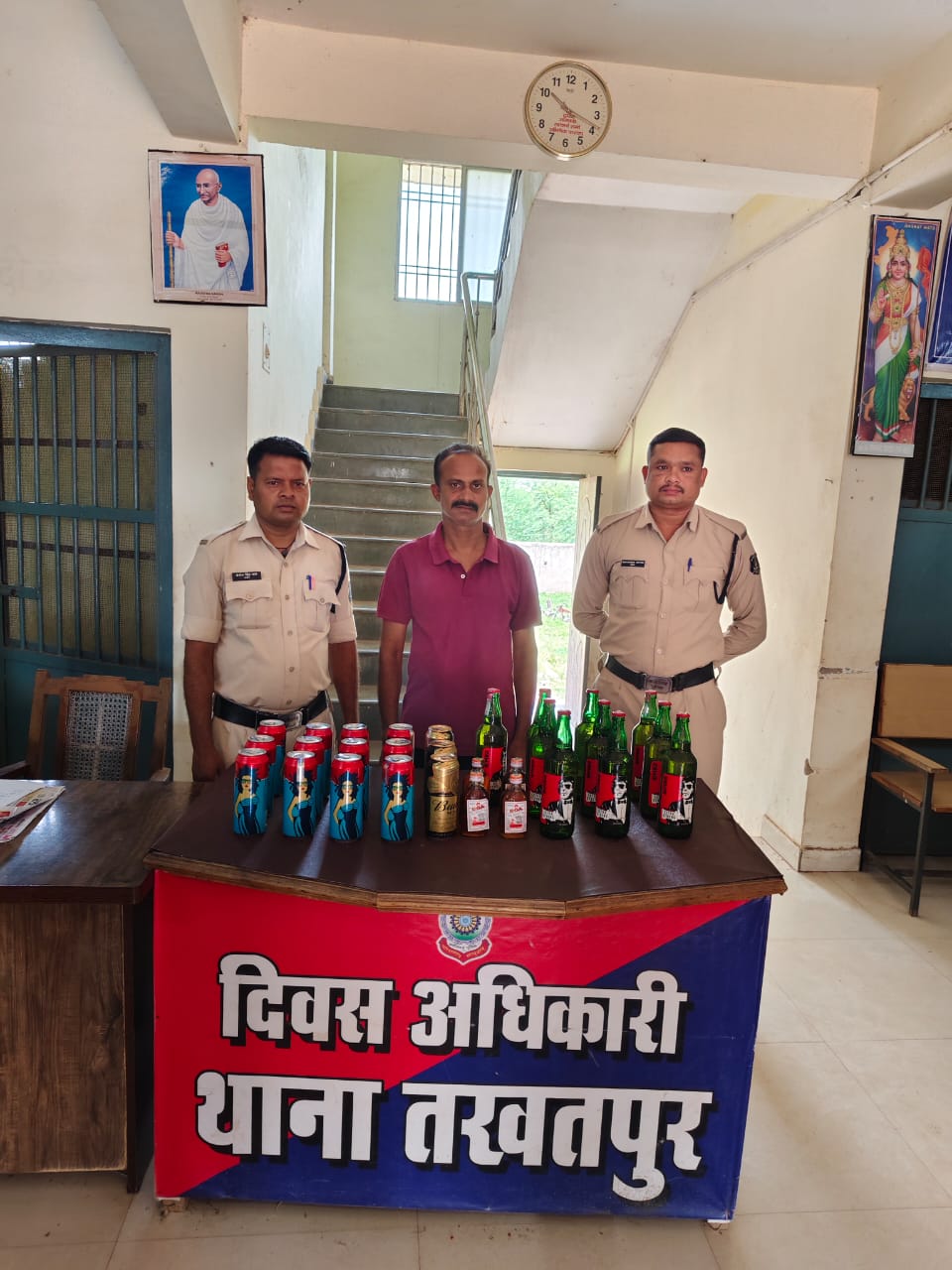 अतिरिक्त पुलिस कप्तान अर्चना झा ने बताया 27 मई को मुखबीर की सूचना पर तखतपुर पुलिस ने ग्राम भीमपुरी स्थित मित्र मिलन ढाबा मे धावा बोला। इसके पहले मुखबीर ने बताया था कि ढाबा संचालक राजीव मिश्रा शराब की अवैध बिक्री करता है। पुलिस टीम ने रेड कार्यवाही कर मौके से 5 नग गोवा स्पेशल शराब, 10 नग शिम्बा बियर बाटल, 12 नग मेडोसा बीयर केन,बटवाईजर बियर केन 3 नग मिलाकर कुल 15 लीटर शराब जब्त किया है। आरोपी के खिलाफ आबकारी की धारा 34(2) का अपराध दर्ज किया गया। गिरफ्तारी के बाद आरोपी को ज्युडिशियल रिमाण्ड पर भेजा गया है।