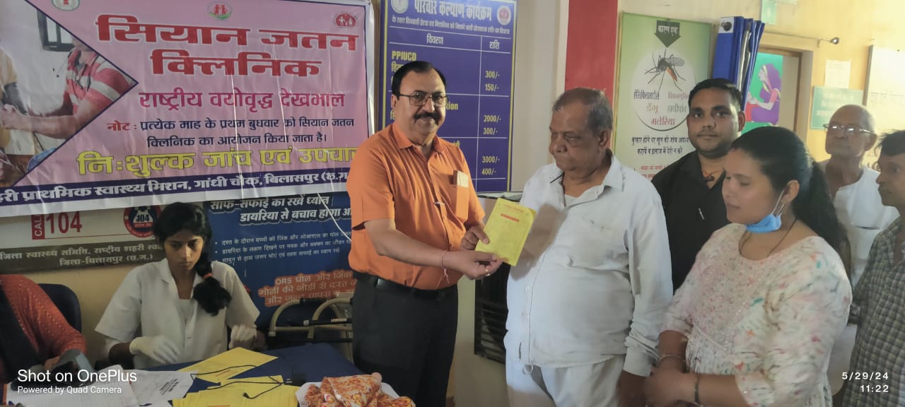 बिलासपुर // राष्ट्रीय शहरी स्वास्थ्य मिशन अंतर्गत संचालित शहरी प्राथमिक स्वास्थ्य केन्द्रों में ‘‘राष्ट्रीय वयोवृद्ध देखभाल’’ कार्यक्रम के तहत आज ‘‘सियान जतन क्लीनिक’’ का विशेष आयोजन किया गया। शहरी प्राथमिक स्वास्थ्य केन्द्रों में 60 वर्ष उम्र के बुजुर्ग व्यक्तियों की निःशुल्क जांच कर उपचार किया गया। 60 वर्ष उम्र के 49 व्यक्तियों का बुजुर्ग कार्ड बनाया गया है। सियान जतन क्लीनिक में दृष्टिदोष से पीड़ित बुजुर्ग व्यक्तियों को चश्मा एवं अन्य जरूरत मंद बुजुर्गाें को छड़ी एवं श्रवण यंत्र बांटे गये। दन्तरोग, मोतियाबिंद, शुगर, बी.पी. जैसे बीमारियों से पीड़ित बुजुर्ग मरीजों की जांच कर उनका इलाज किया गया।