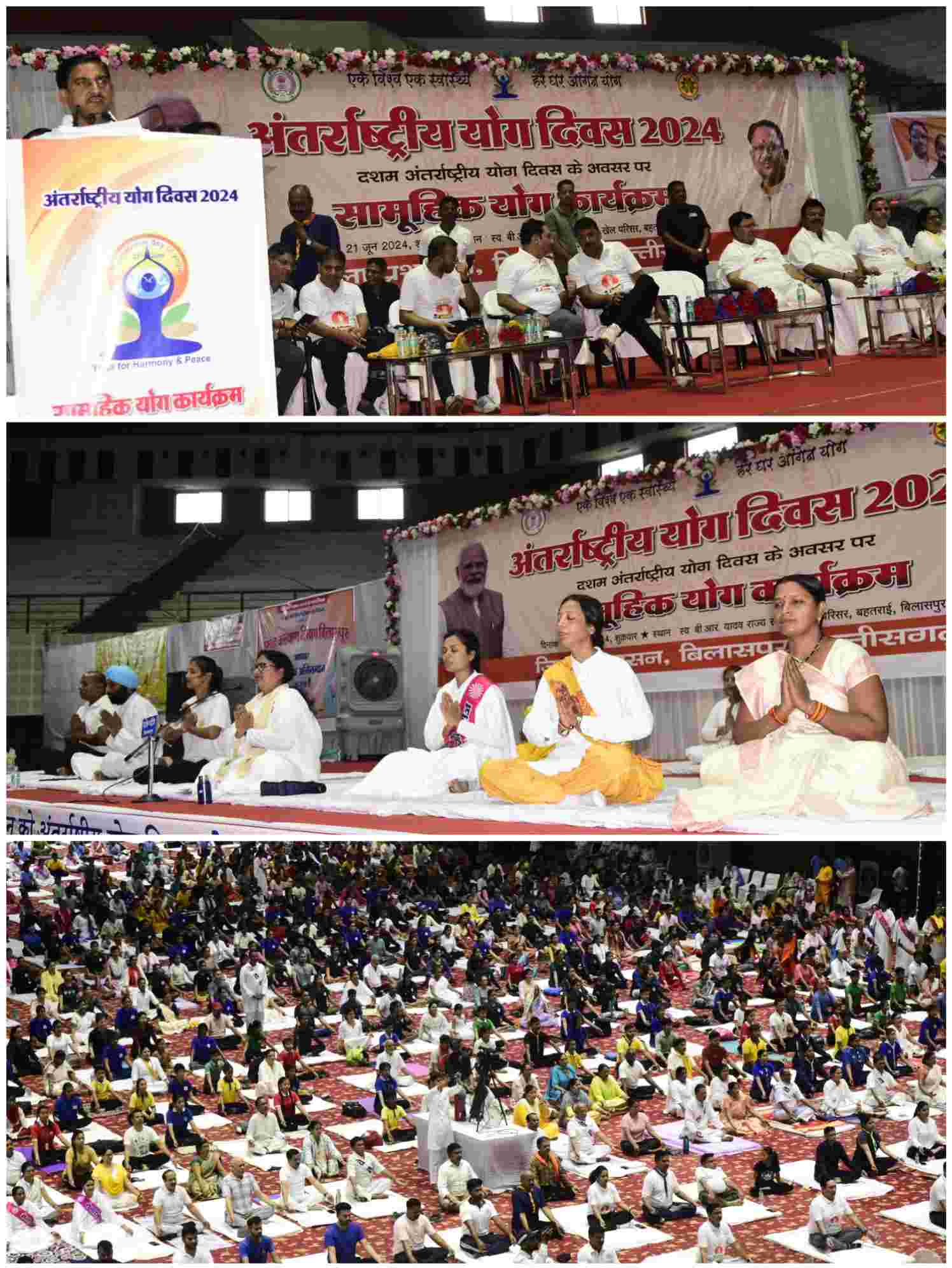 बिलासपुर // अंतर्राष्ट्रीय योग दिवस के अवसर पर बहतराई स्टेडियम में पूरे उत्साह के साथ योग दिवस मनाया गया। इस अवसर पर कार्यक्रम के मुख्य अतिथि केंद्रीय शहरी विकास राज्य मंत्री तोखन साहू ने विभिन्न मुद्राओं में योगाभ्यास किया। स्वयं और समाज के लिए योग थीम पर दसवें अंतर्राष्ट्रीय योग दिवस का आयोजन किया गया। जिला स्तरीय इस योगाभ्यास कार्यक्रम में बेलतरा विधायक सुशांत शुक्ला, जिला पंचायत अध्यक्ष अरूण सिंह चौहान, पूर्व सांसद लखन लाल साहू, रामदेव कुमावत, संभागायुक्त डॉ. संजय अलंग ने भी योगाभ्यास किया। हजारों की संख्या में बच्चों एवं नागरिकों ने योगाभ्यास एवं प्राणायाम किया। इस अवसर पर ब्रम्हाकुमारी दीदी मंजू सहित अन्य योग प्रशिक्षकों, योगाचार्यों के मागदर्शन में प्रतिभागियों द्वारा योगाभ्यास, ताड़ासन, वक्रासन, प्राणायाम जैसे अनुलोम विलोम, कपालभाति, भुजंगासन, भ्रामरी जैसे आसानों का अभ्यास एवं ध्यान किया गया।