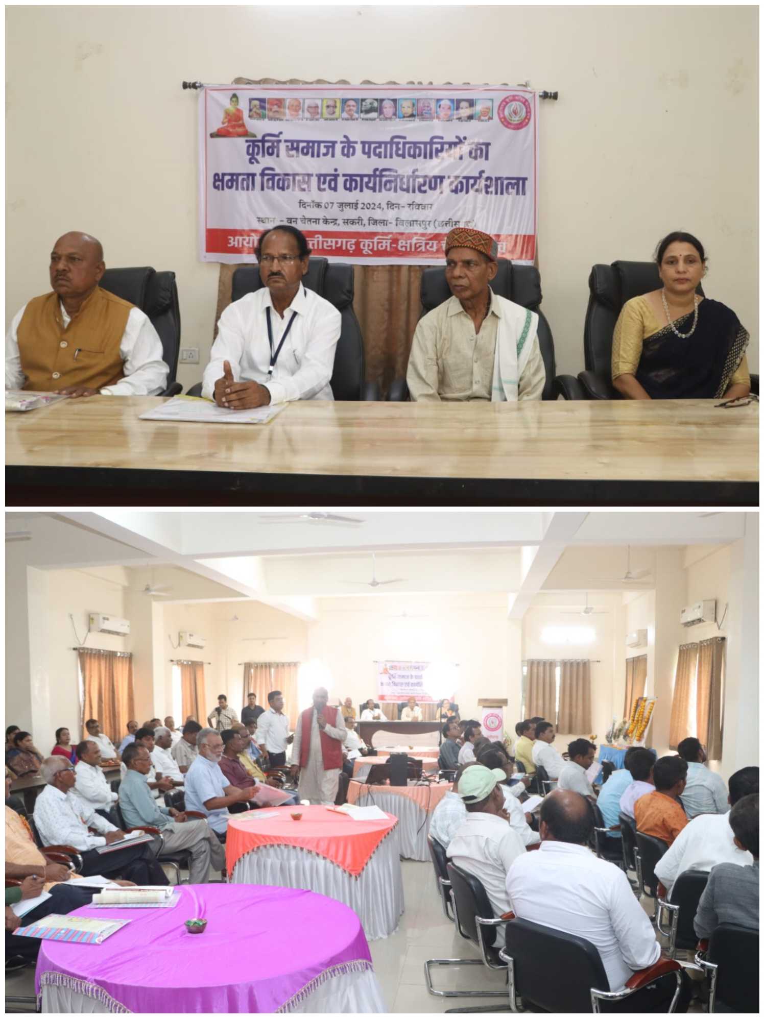 बिलासपुर :- छत्तीसगढ़ कूर्मि क्षत्रिय चेतना मंच द्वारा आयोजित छत्तीसगढ़ में निवासरत समस्त फिरका 30 प्रकार के कूर्मि उपजाति समूह के प्रमुखो एवं संगठन पदाधिकारियों का क्षमता विकास प्रशिक्षण कार्ययोजना निर्धारण- कार्यशाला का आयोजन *वन चेतना केंद्र सकरी* बिलासपुर में सफलता पूर्वक संपन्न हुआ। इसमें रायपुर, बिलासपुर, दुर्ग भिलाई, जांजगीर -चांपा,,सक्ति , मनेंद्रगढ़, कोरिया, कवर्धा पेंड्रा मरवाही, मुंगेली, बेमेतरा , पामगढ़ तखतपुर, ,पाली ,कटघोरा ,कोरबा से 155 समाज प्रमुखों ने हिस्सा लिया। इसमें समाज मे व्याप्त रूढ़िवादी परंपरा, वैज्ञानिक सोंच, शिक्षा , व्यवसाय को बढ़ावा, प्रगतिशील कूर्मि समाज के समग्र विकास हेतु युवाओं तथा महिलाओं की भूमिका को सुनिश्चित करने व आधुनिक समाज में वर्तमान परिदृश्य में हो रहे बदलाव पर लाए गए पूर्व प्रस्ताव के क्रियान्वयन में धीमी गति क्यों ? जैसे विषय पर समीक्षा उपरांत नवीन प्रस्ताव पर चर्चा हुई। प्रथम सत्र के मुख्य अभ्यागत विधायक माननीय व्यास नारायण कश्यप जांजगीर चांपा थे एवं द्वितीय सत्र के मुख्य अभ्यागत माननीय विधायक धरमलाल कौशिक जी रहे ।मंच में विधायक द्वय का शाल श्रीफल बूके से अभिनंदन किया गया । अखिल भारतीय कूर्मि महासभा के संरक्षक श्री मन्नू लाल परगनिया, प्रदेश कूर्मि क्षत्रिय समाज के महामंत्री मोरध्वज चंद्राकर,देशहा कूर्मि समाज अध्यक्ष हीरा सिंह कश्यप, रामशंकर, कश्यप पाटनवार फिरका से सतीश कुमार पाटनवार , बैसवाड़े से रामनारायण कश्यप,परगिया कूर्मि समाज से रामावतार वर्मा,सिगरौर से कौशल सिंह वर्मा, दिल्लीवार कूर्मि समाज से डॉ राजेन्द्र हरमुख , सन्नाड्य कूर्मि से कृष्ण कुमार कौशिक, सिंगरौल से बिरझेराम सिंगरौल ,रामू सिंगरौल,बडगैहा से हरिश्चंद्र वर्मा,बंधईया कूर्मि से अश्विनी कश्यप,भोला कूर्मि छात्रावास ट्रस्ट रायपुर से डॉ मनोज वर्मा, संतोष कौशिक गुरूजी, चंदेल रत्नेश्वर कूर्मि समाज से मनोहर लाल चंदेल,तिरेला कूर्मि समाज से ललित काकडे कन्नौजिया कूर्मि समाज से डॉ हेमंत कश्यप , चंद्नाहू से अरूण कश्यप अलग अलग छ: सत्रों के विषय में श्रोत व्यक्ति के रूप में मंचासीन हुए एवं विचार प्रवाह में हिस्सा लिया।