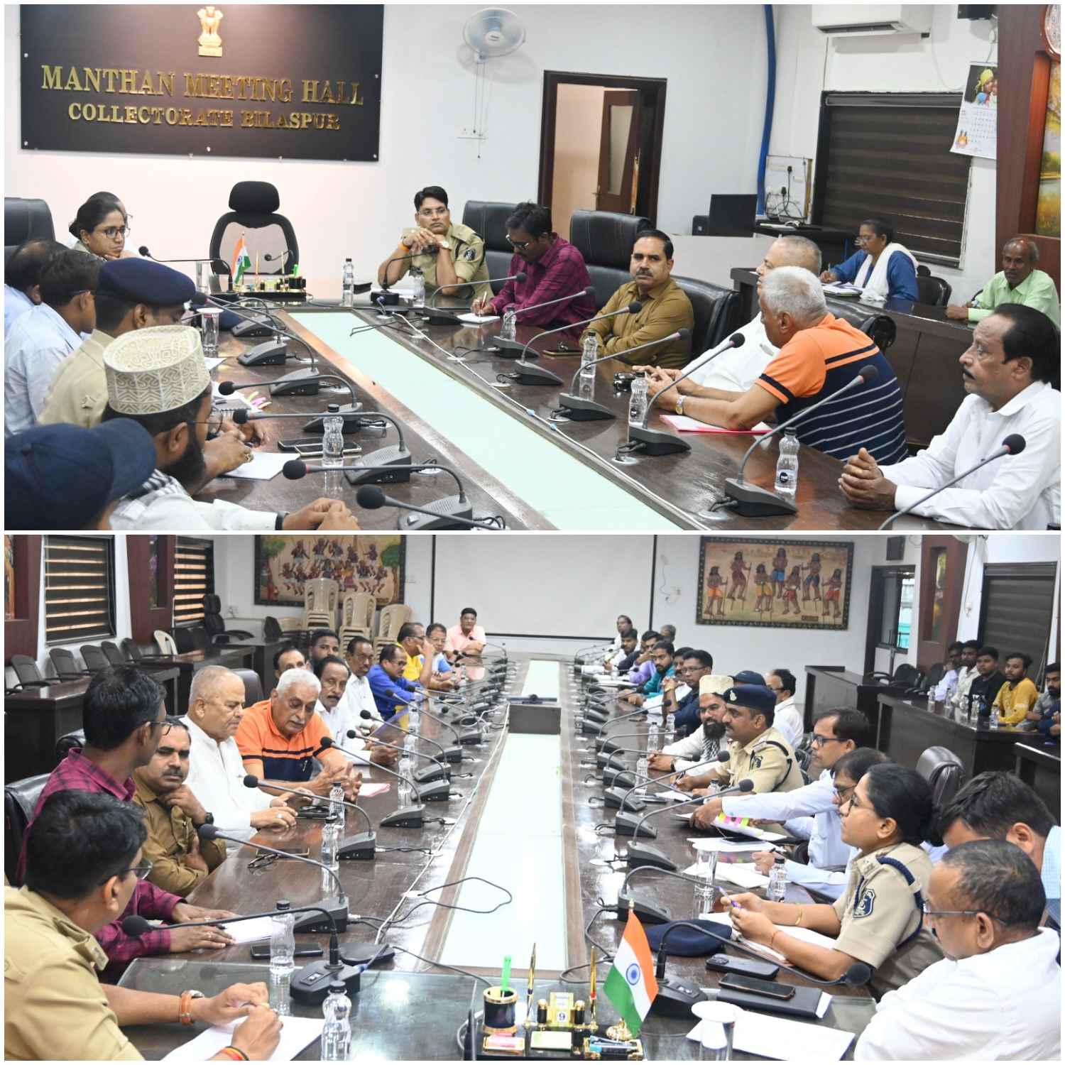 बिलासपुर // जिला कार्यालय के मंथन सभाकक्ष में शांति समिति की बैठक आयोजित की गई। बैठक में मोहर्रम पर्व आपसी भाईचारे के साथ सौहार्द्रपूर्ण ढंग से मनाने का निर्णय लिया गया। एडीएम आरए कुरूवंशी ने शहर की गौरवशाली परंपरा के अनुरूप सदभावनापूर्वक पर्व मनाने की अपील की। शांति समिति के सदस्यों ने भी शांतिपूर्ण तरीके से पर्व मनाने का भरोसा दिलाया। बैठक में पुलिस विभाग को मोहर्रम पर्व के दिन ताजिया एवं विसर्जन के दौरान सुरक्षा एवं शांति व्यवस्था बनाये रखने, नगर निगम को ताजिया एवं विसर्जन स्थल की साफ-सफाई के साथ लाईट एवं पेयजल की व्यवस्था करने के साथ विद्युत विभाग को सुचारू बिजली व्यवस्था की जिम्मेदारी सौंपी गई। वहीं स्वास्थ्य विभाग को पर्व के दौरान आपातकालीन चिकित्सा की तैयारी साथ सतर्क रहने को कहा गया। इस अवसर पर एडिशनल एसपी उमेश कुमार कश्यप, सिटी एसपी पूजा कुमार, संयुक्त कलेक्टर एसएस दुबे, नगर निगम के अपर आयुक्त खजांची कुमार, शांति समिति के सदस्य हबीब मेमन, इरसाद अली, फिरोज कुरैशी सहित शांति समिति के सदस्य मौजूद थे।