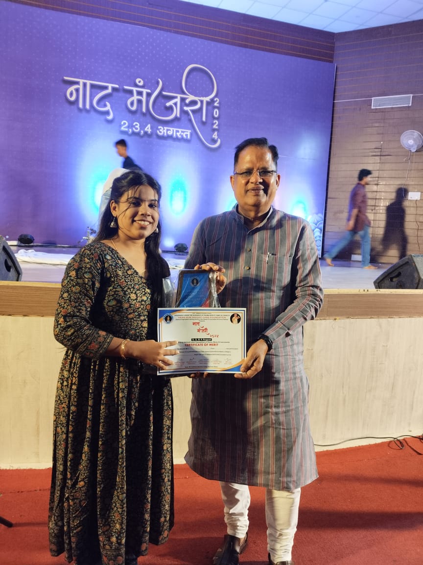 इंदिरा गांधी कृषि विश्वविद्यालय के ऑडिटोरियम में आयोजित नाद मंजरी 2024 में आज बिलासपुर की जान्हवी मिश्रा ने गायन प्रतियोगिता में तीसरा स्थान प्राप्त किया। विधायक अग्रवाल ने जान्हवी मिश्रा को मेडल और प्रमाण पत्र देकर सम्मानित किया और उन्हें उज्जवल भविष्य की शुभकामनाएं दीं।