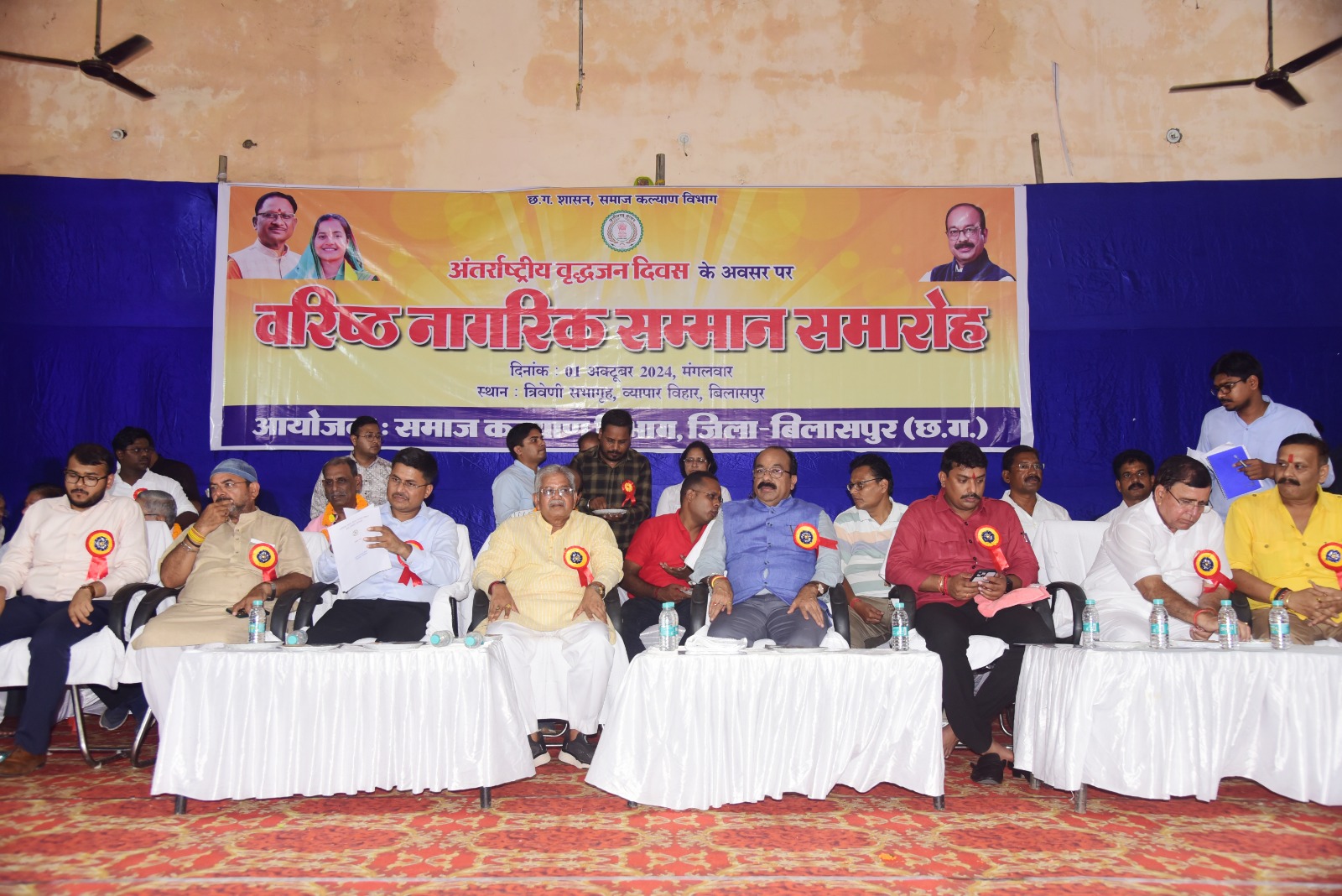 कार्यक्रम को संबोधित करते हुए उप मुख्यमंत्री श्री अरूण साव ने कहा कि प्रधानमंत्री नरेन्द्र मोदी देश के बुजुर्गों के लिए श्रवण कुमार बन उनकी सेवा कर रहे हैं। उन्होंने 70 साल से अधिक उम्र के वृद्धजनों के लिए 5 लाख रुपए तक के मुफ्त इलाज की व्यवस्था की है। प्रधानमंत्री श्री मोदी और विष्णु देव साय की सरकार ने बुजुर्गाे को सम्मानित किया है। उनके द्वारा आपके लिए कई योजनाएं संचालित की जा रही है। उन्होंने कहा कि त्रिवेणी उस स्थान को कहते हैं जहां तीन नदियों का संगम होता है। आज त्रिवेणी भवन में इतनी बड़ी संख्या में वरिष्ठजनों की मौजूदगी से यह जगह वास्तव में तीर्थ स्थान जैसा लग रहा है। बुजुर्गाे के आशीर्वाद से हमें ताकत मिलती है। उन्होंने कहा कि बुजुर्गाे का सम्मान आदि काल से हमारी संस्कृति का अटूट हिस्सा रही है। आप अनुभव का खजाना होते हैं जो हमारी बड़ी से बड़ी समस्याओं को चुटकियों में हल कर देते हैं। कार्यक्रम की अध्यक्षता कर रहे बिल्हा विधायक श्री धरम लाल कौशिक ने कहा कि छत्तीसगढ़ सरकार द्वारा बुजुर्गाे का सम्मान करते हुए उनकी बेहतरी के लिए योजनाएं चलाई जा रही है इसलिए हमारा छत्तीसगढ़ नई ऊंचाईयों को छू रहा है। वरिष्ठजनों के सम्मान से ही परिवार व्यवस्थित और संस्कारी रहता है। उनसे ही बच्चों को संस्कार और सीख मिलती है। परिवार को सही दिशा मिलती है।