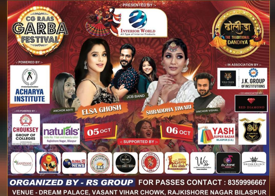 आज, 5 अक्टूबर को लोकप्रिय अभिनेत्री एल्सा घोष पूरे बिलासपुर वासियों के साथ गरबा नृत्य में शिरकत करेंगी। कल, 6 अक्टूबर को मशहूर एक्ट्रेस श्रद्धा तिवारी बिलासपुरवासियों के साथ मस्ती में झूमते हुए नजर आएंगी।