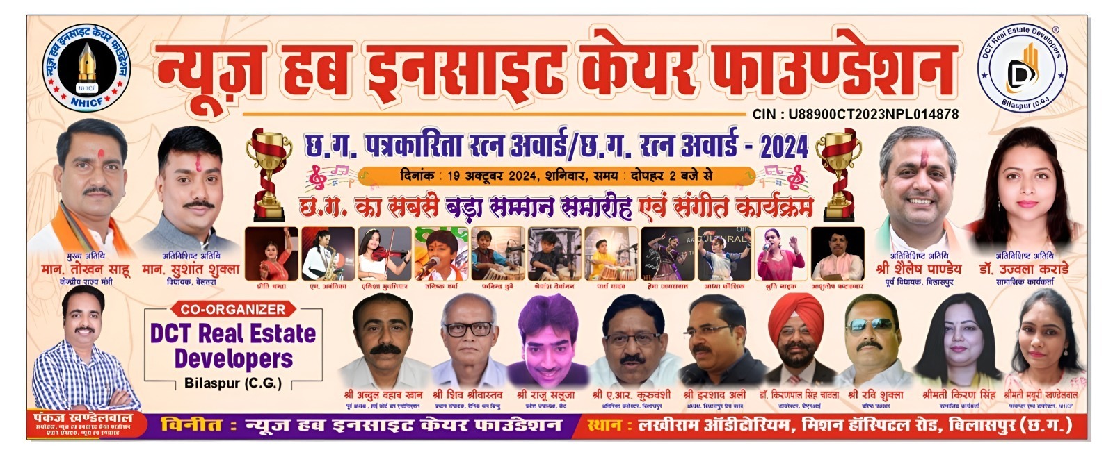 बिलासपुर :— न्यूज़ हब इनसाइट केयर फाउंडेशन के बैनर तले छत्तीसगढ़ की सबसे बड़ी अवार्ड सेरेमनी का आयोजन 19 अक्टूबर को लखीराम ऑडिटोरियम में किया जाएगा। इस समारोह में पत्रकारों एवं समाजसेवियों का सम्मान किया जाएगा।अवार्ड्स:पत्रकारों को छत्तीसगढ़ पत्रकारिता रत्न अवार्ड 2024 से सम्मानित किया जाएगा।विभिन्न क्षेत्रों के लोगों को छत्तीसगढ़ रत्न अवार्ड 2024 से नवाजा जाएगा।इस विशेष समारोह के मुख्य अतिथि केन्द्रीय मंत्री तोखन साहू होंगे। साथ ही, अतिविशिष्ट अतिथि के रूप में बेलतरा विधायक सुशांत शुक्ला और बिलासपुर के पूर्व विधायक शैलेश पांडे उपस्थित रहेंगे। वहीं, विशिष्ट अतिथि के रूप में दैनिक अखबार श्रम बिंदु के संपादक शिव श्रीवास्तव, बिलासपुर प्रेस क्लब अध्यक्ष इरशाद अली, सामाजिक कार्यकर्ता उज्वला कराडे, वरिष्ठ पत्रकार रवि शुक्ला, हाई कोर्ट बार एसोसिएशन के पूर्व अध्यक्ष अब्दुल वहाब खान, कैट के प्रदेश उपाध्यक्ष राजू सलूजा, अतिरिक्त कलेक्टर आर. ए. कुरुवंशी के साथ किरण सिंह एवं किरनपाल चावला रहेंगे.इस दौरान, उपस्थित दर्शकों के लिए संगीत की प्रस्तुतियाँ भी होंगी, जो कार्यक्रम को और भी जीवंत बनाएंगी।फाउंडेशन के फाउंडर एंड डायरेक्टर और न्यूज़ हब इनसाइट के प्रधान संपादक पंकज खण्डेलवाल ने इस आयोजन की जानकारी दी और बताया कि यह समारोह पत्रकारिता और समाज सेवा के क्षेत्र में उत्कृष्टता को पहचानने का एक महत्वपूर्ण अवसर है।कार्यक्रम की तैयारियों में जुटे संगठन के सदस्यसमारोह की तैयारियों में न्यूज़ हब इनसाइट केयर फाउंडेशन के सदस्य सक्रिय रूप से जुटे हुए हैं। यह आयोजन न केवल पत्रकारों के लिए, बल्कि समाज के सभी क्षेत्रों के लोगों के लिए एक प्रेरणादायक अवसर बनेगा।सभी को इस भव्य समारोह में शामिल होने के लिए आमंत्रित किया जाता है।