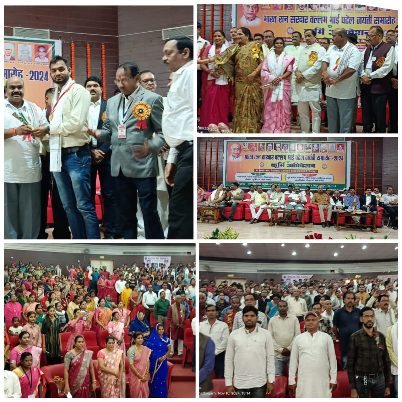 बिलासपुर:- भारत रत्न लौह पुरुष सरदार वल्लभ भाई पटेल जी की 150 वीं जयंती के उपलक्ष्य में छत्तीसगढ़ कूर्मि क्षत्रिय चेतना मंच द्वारा पखवाड़ा समापन समारोह में सामाज के विशिष्ट प्रतिभाओं का मंच में गरिमापूर्ण सम्मान किया गया। इसमें हाईस्कूल /हायर सेकंडरी के टापर 30 विद्यार्थियों को प्रतिभावान विद्यार्थी पुरस्कार, नेट सेट गेट पीएससी चयनित को विशिष्ट प्रतिभा सम्मान, कृषि के क्षेत्र में शिवकुमार चंद्रवंशी कबीर धाम को कूर्मि कृषि रत्न सम्मान, हीरालाल कश्यप जांजगीर को कूर्मि कृषि भूषण सम्मान, श्रीमती दिव्या जदुनंदन वर्मा (महिला कृषक) को कूर्मि कृषि श्री सम्मान से सम्मानित किया गया। मुख्य अतिथि व्यास कश्यप विधायक ने सरदार पटेल जी के राष्ट्रीय एकीकरण को याद किया। उन्होंने सम्मानित प्रतिभागियों को बधाई देते हुए कूर्मि चेतना मंच द्वारा कूर्मियो की दिशा दशा व भविष्य निर्धारण हेतु चेतना जागृत करने वाले विभिन्न गतिविधियां, साहित्य प्रकाशन, नेतृत्व क्षमता विकास जैसे प्रशिक्षण कार्यक्रम की सराहना की । बैरिस्टर ठा छेदीलाल कृषि महाविद्यालय आडिटोरियम में आयोजित भव्य समारोह स्थल पर दिव्या कौशिक द्वारा सरदार पटेल जी की रंगोली चित्र कला ने सभी को आकर्षित किया। छत्तीसगढ़ कूर्मि क्षत्रिय चेतना मंच का यह 31 वां वार्षिक अधिवेशन था जिसकी अध्यक्षता ईंजी लक्ष्मी कुमार गहवई,प्रदेशाध्यक्ष ने की । समाज विकास के लिए युवा पीढी को आगे आने उन्होंने आव्हान किया। अतिथियों ने *कूर्मि चेतना पंचांग 20225* का विमोचन किया एवं पंचांग के राष्ट्रीय संयोजक बी आर कौशिक ने पंचांग के पीछे प्रकाशित लेख को कैरियर विकास के लिए बहुउपयोगी बताया।प्रदेश स्तरीय वृहद आयोजन की अध्यक्षता बैजनाथ चंद्राकर पूर्व अध्यक्ष अपेक्स बैंक ने की । विशिष्ट अतिथि ललित बघेल, राष्ट्रीय संगठन मंत्री अखिल भारतीय कुर्मी महासभा, श्रीमती तारा चंद्राकर प्रदेश कूर्मि समाज रायपुर महिला अध्यक्ष , मोरध्वज चंद्राकर महामंत्री प्रदेश कूर्मि क्षत्रिय समाज,रायपुर ,डॉ एल सी मढरिया सुप्रसिद्ध नेत्र रोग विशेषज्ञ एवं समाज सेवी ,प्रमोद नायक पूर्व जिलाध्यक्ष सहकारी बैंक बिलासपुर , गिरीश पटेल ,रमेश पटेल सरगुजा, रविन्द्र पटेल ललित बघेल डॉ जीतेन्द्र सिंगरौल रायपुर , रविन्द्र पटेल मनेंद्रगढ़, चिरमिरी, प्रेमलाल पटेल पेंड्रा मरवाही, श्रीमती भारती कश्यप प्रदेशाध्यक्ष महिला प्रकोष्ठ, नंदिनी पाटनवार, रंजना वर्मा,शकुंतला पाटनवार सहित समाज के विभिन्न फिरका प्रमुख मंचासीन हुए। कार्यक्रम के संयोजक देव चंद्राकर जिलाध्यक्ष ग्रामीण, द्वारा प्रथम सत्र का स्वागत भाषण व अनिल वर्मा जिला युवाध्यक्ष द्वारा द्वितीय सत्र स्वागत भाषण दिया गया। प्रदेश महा