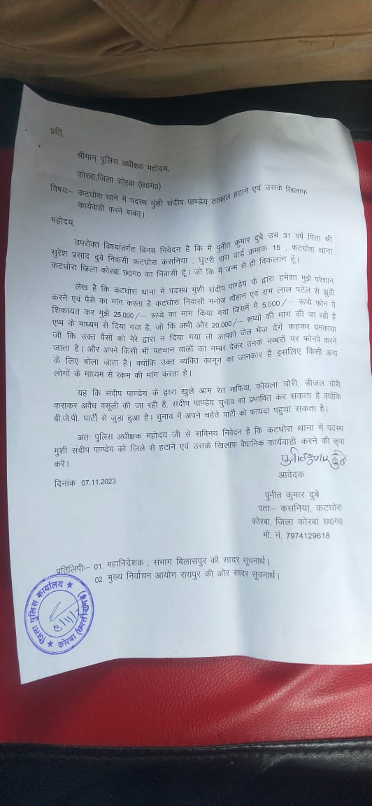 कोरबा • कटघोरा थाना में लम्बे समय से पैर जमाये एवं लगातार सुर्खियों में रहने वाले प्र.आ. संदीप पाण्डेय का दिनांक 08/11/2023 को कोरबा पुलिस अधीक्षक में लिखित शिकायत कर कोरबा जिला से तत्काल हटाने एवं उसके खिलाफ कार्यवाही की मांग किया गया है,जिसमें शिकायत कर्ता पुनीत कुमार दुबे पिता सुरेश कुमार दुबे निवासी कसनिया(कटघोरा) ने शिकायत पत्र में उल्लेख किया है की संदीप पाण्डेय के द्वारा मेरे खिलाफ झूठी शिकायत करवाकर 25000/रूपये की मांग किया गया, जिसमें मेरे द्वारा 5000 / फ़ोन पे के माध्यम से लिया गया और उक्त पैसो को लेकर मेरे द्वारा नहीं दिया गया तो तुमको जेल भेज दूंगा कहकर धमकाया जाता है।जिससे मै बहुत डरा व अत्यंत भयभीत हु, अपने किसी भी पहचान वालों का नंबर देकर उनके नम्बरों पर फ़ोन पे करने के लिए बोला जाता है। क्योंकि उक्त ब्यक्ति कानून का जानकार है इसलिए किसी अन्य लोगो के माध्यम से रकम की मांग करता है।