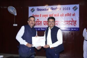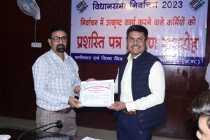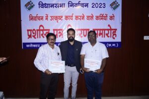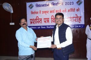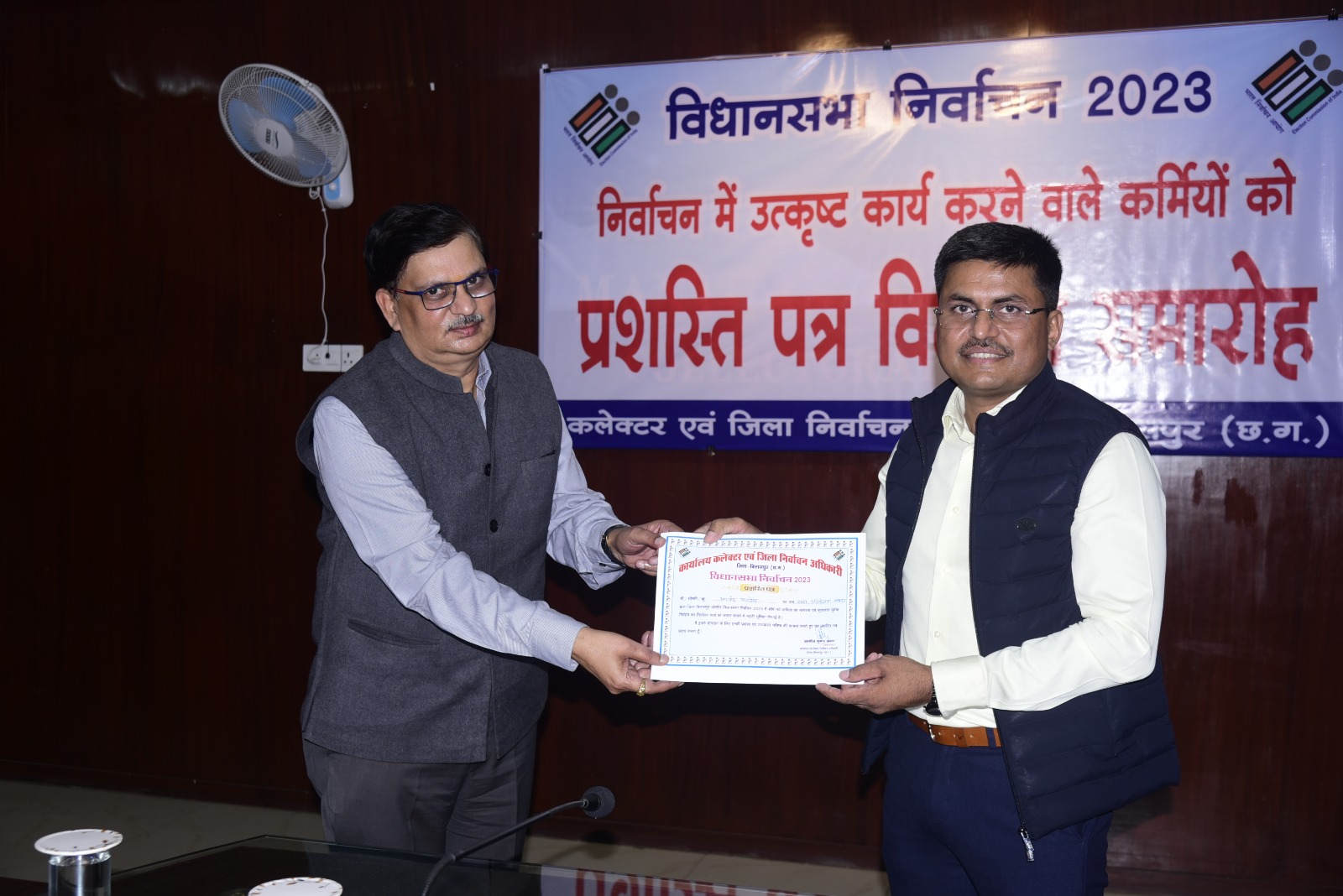 बिलासपुर • कलेक्टर एवं जिला निर्वाचन अधिकारी श्री अवनीश शरण ने विधानसभा चुनाव में बेहतरीन काम करने वाले अधिकारी कर्मचारियों को प्रशस्ति पत्र से सम्मानित किया है। उन्होंने निकट भविष्य में होने वाले चुनाव में भी इसी तरह लगनपूर्वक काम करने की सबसे अपेक्षा की है। मंथन सभाकक्ष में आयोजित सम्मान समारोह में निगम आयुक्त श्री कुणाल दुदावत और जिला पंचायत सीईओ अजय अग्रवाल भी उपस्थित थे।