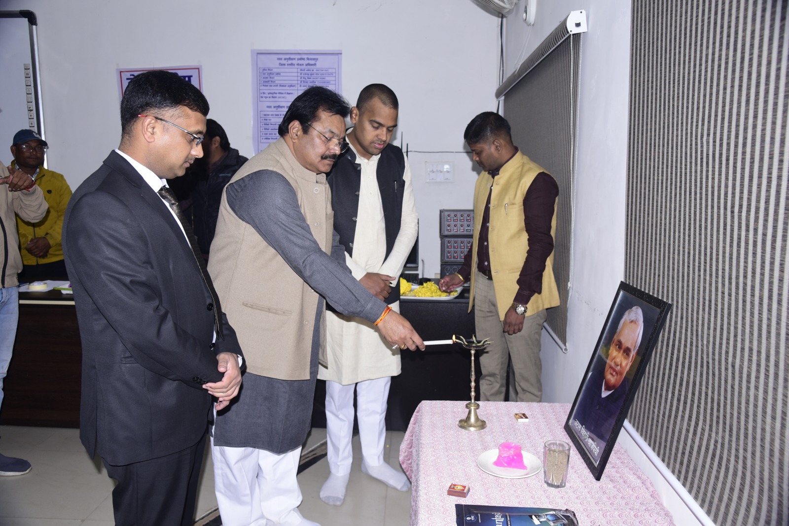 जिला पंचायत सभाकक्ष में भी सुशासन दिवस मनाया गया। कार्यक्रम में जिला पंचायत अध्यक्ष श्री अरूण सिंह चौहान ने पूर्व प्रधानमंत्री स्व. श्री अटल बिहारी वाजपेयी जी के छांयाचित्र पर माल्यार्पण कर उन्हें सादर नमन किया। कार्यक्रम में सभी ने सुशासन स्थापित करने का संकल्प लिया। इस अवसर पर जिला पंचायत सभापति श्री अंकित गौराहा, जिला पंचायत सदस्य श्रीमती गौरी बघेल, जिला पंचायत के मुख्य कार्यपालन अधिकारी श्री अजय अग्रवाल सहित अधिकारी कर्मचारी मौजूद थे।